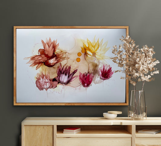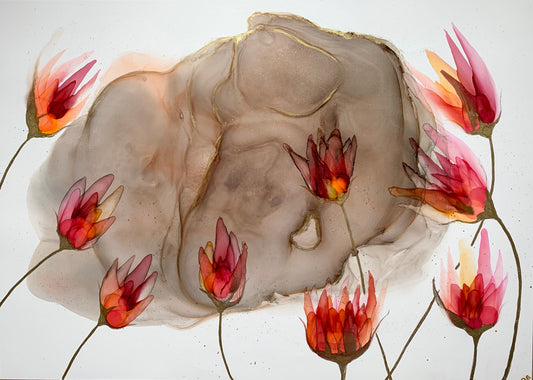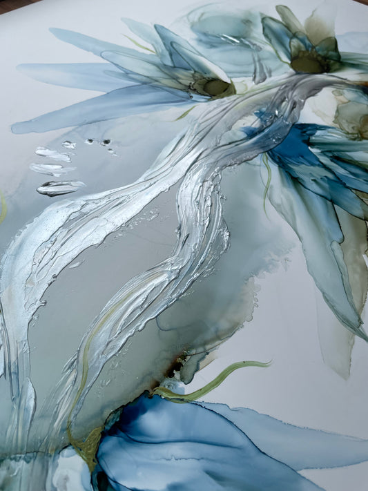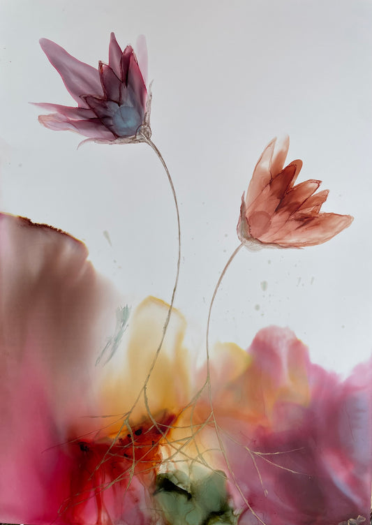 Dancing in the Shadows II, large alcohol ink painting with flowers.