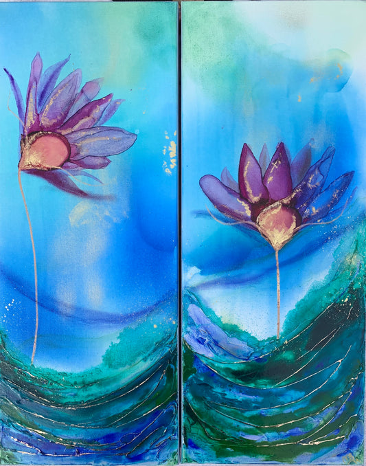 In the Current. Original floral art on canvas. Diptych painting with lotus flowers. Wall art.